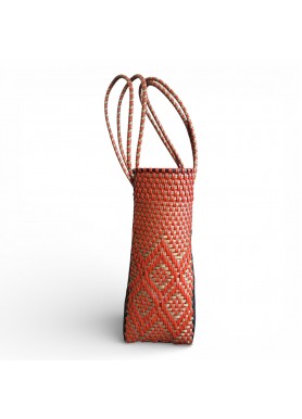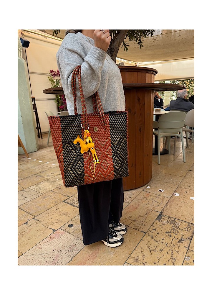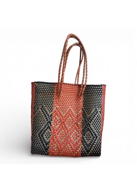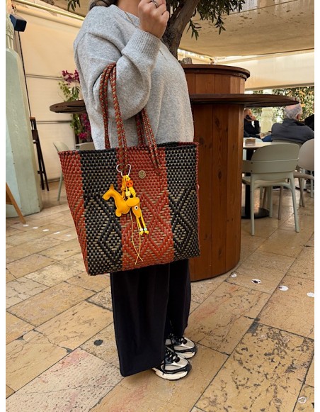 Bolso tejido a mano en México con cintas plásticas de alta resistencia. Su diseño geométrico en tonos terracota, negro y arena aporta carácter y estilo natural. Ligero, resistente y con estructura firme, ideal para el día a día.