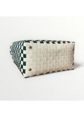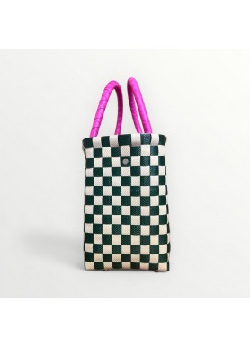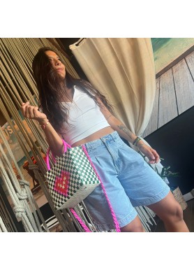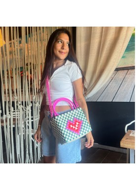 Hecho a mano con plástico reciclado, combina arte, sostenibilidad y un diseño moderno que destaca por su encanto único. Sus asas rosadas trenzadas aportan un toque femenino y vibrante.