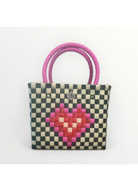 Tejido a mano con plástico reciclado y motivo de corazón. Un diseño artesanal que refleja amor, color y sostenibilidad.