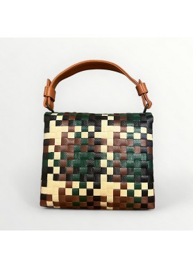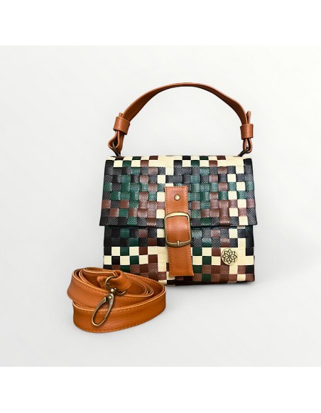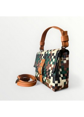 Su diseño entrelazado en tonos tierra, verde y crema evoca el encanto atemporal de las calles vienesas, mientras que sus acabados en piel café aportan un aire cálido y distinguido.