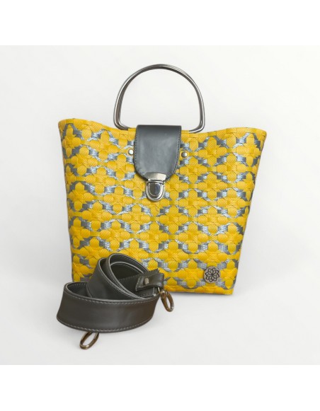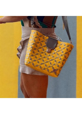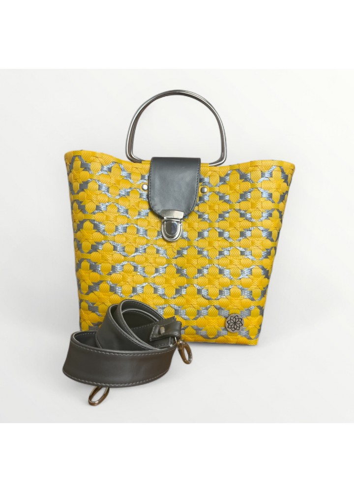 💛 Bolso Burdeos: contraste vibrante en amarillo y gris metálico ✨. Artesanal 🤲, resistente ♻️ y versátil 👜 con correa ajustable incluida.