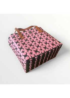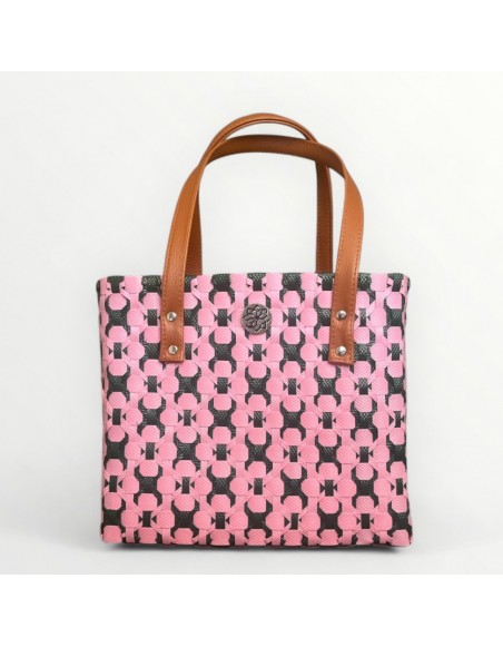 El Bolso Milán es la fusión ideal entre sofisticación y frescura. Su patrón geométrico en tonos rosa y verde, tejido artesanalmente, evoca el espíritu cosmopolita de la moda italiana, mientras que sus asas en tono marrón aportan calidez y un contraste elegante.