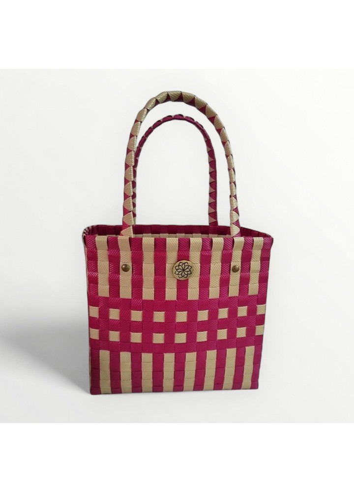 Hecho a mano con plástico reciclado de alta calidad, este bolso refleja el compromiso con la sostenibilidad sin renunciar al estilo. Sus asas trenzadas bicolor aportan firmeza, comodidad y un toque chic que lo convierte en un accesorio imprescindible para cualquier ocasión.