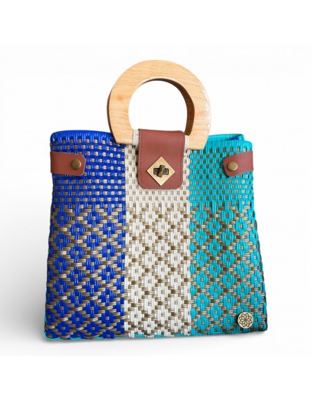 Bolso tejido a mano en México con cintas plásticas de alta resistencia. Su diseño geométrico en tonos azules y turquesa aporta frescura y luminosidad. Incluye forro interior de algodón con bolsillo, estructura firme y asa de madera, ideal para el día a día.