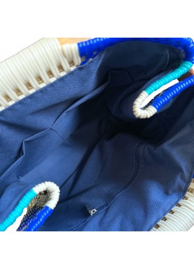 Tejido a mano en México con cintas plásticas de alta resistencia por artesanos mexicanos, es un bolso ligero, duradero y funcional. A diferencia de otros modelos de la colección, el Bolso Mar está forrado en su interior con tela de algodón, incorporando un bolsillo interior con cremallera que aporta mayor comodidad y protección. Su asa rígida de madera añade un toque natural y elegante que realza el diseño.